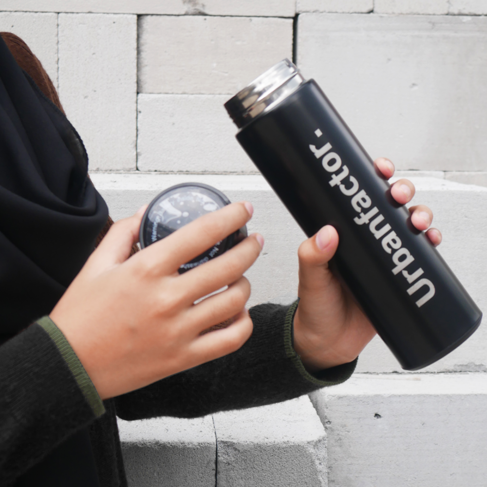 Thumbler Urbanfactor. terdapat 2 warna, yaitu Hitam dan Merah. Memiliki fasilitas ukuran suhu air yang terdapat di dalam thumbler tersebut sehingga membuat kita tahu apakah air minum kita panas, hangat atau normal.
