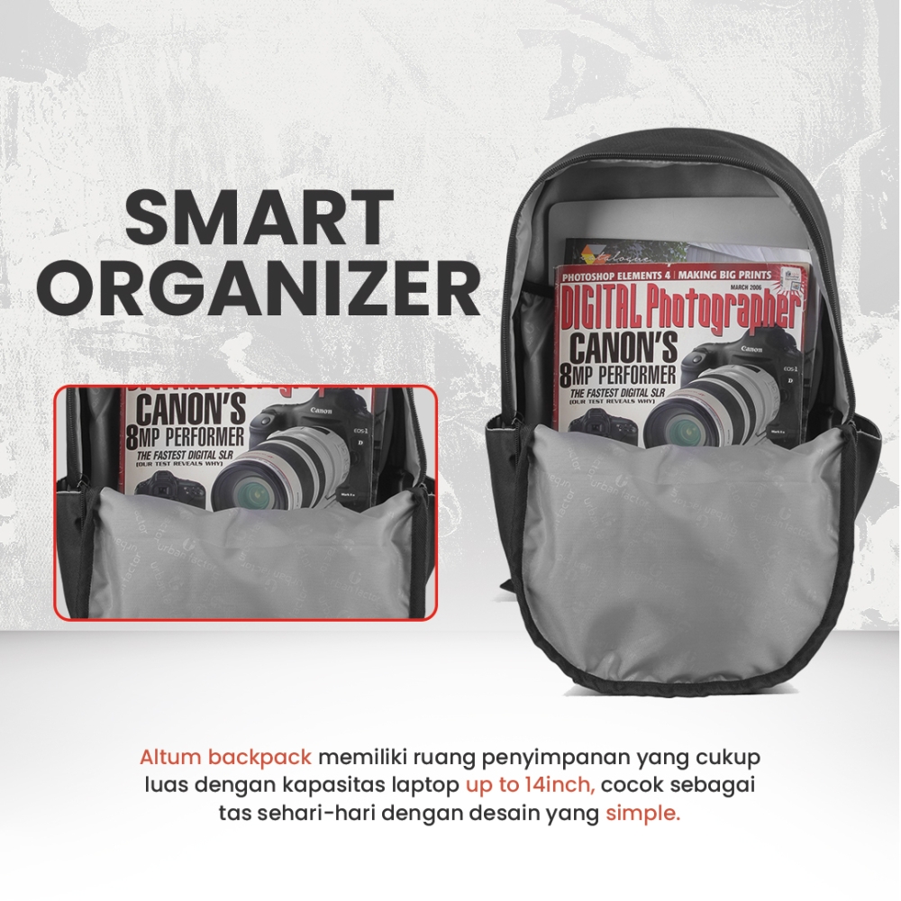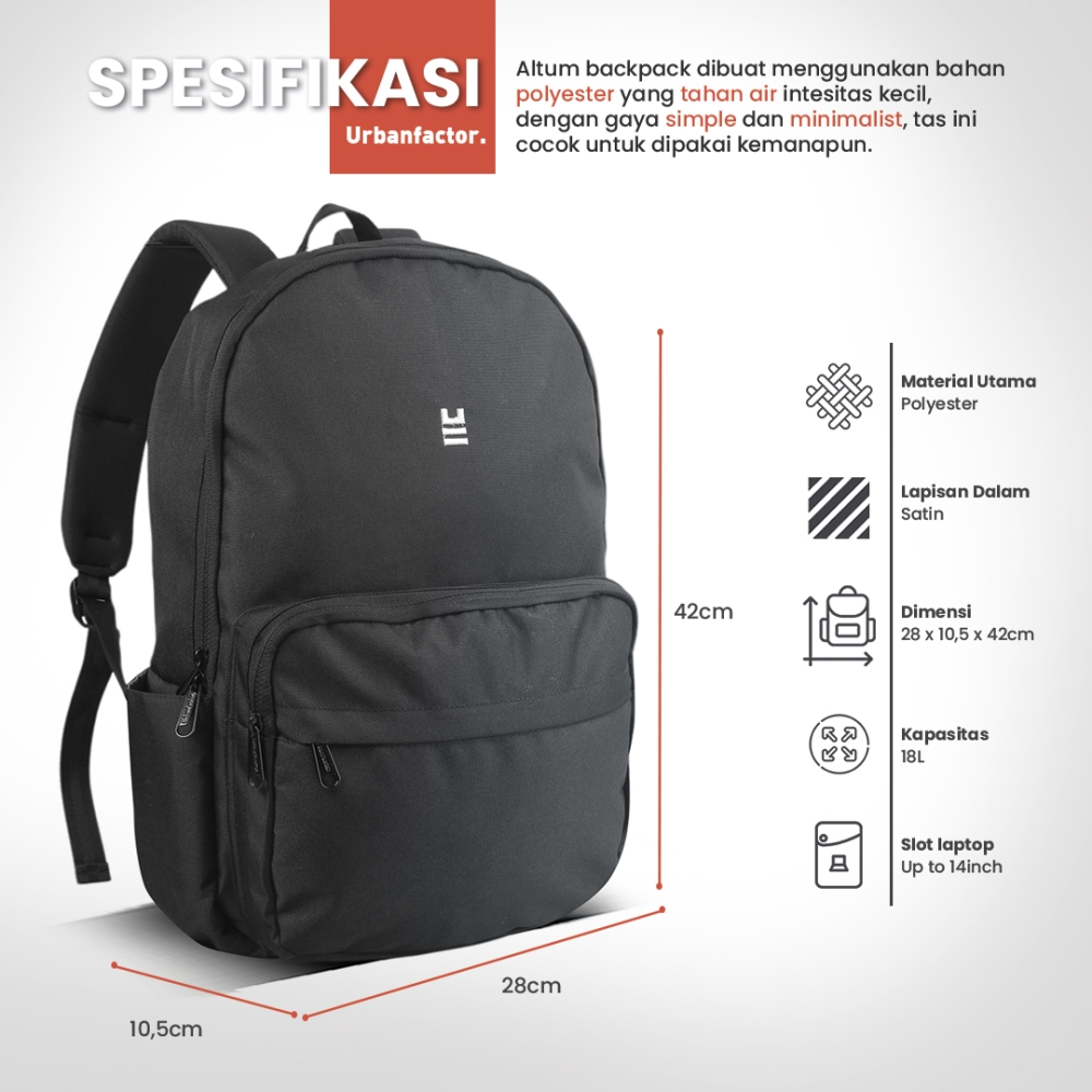 Altum adalah salah satu series Daypack urbanfactor, Daypack minimalis dengan desain elegan, ringan, dan nyaman untuk aktivitas harian, cocok untuk kerja, kuliah, atau jalan santai.