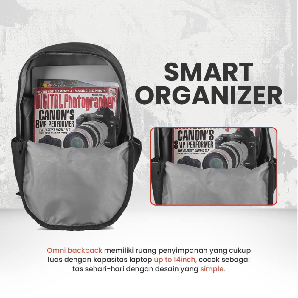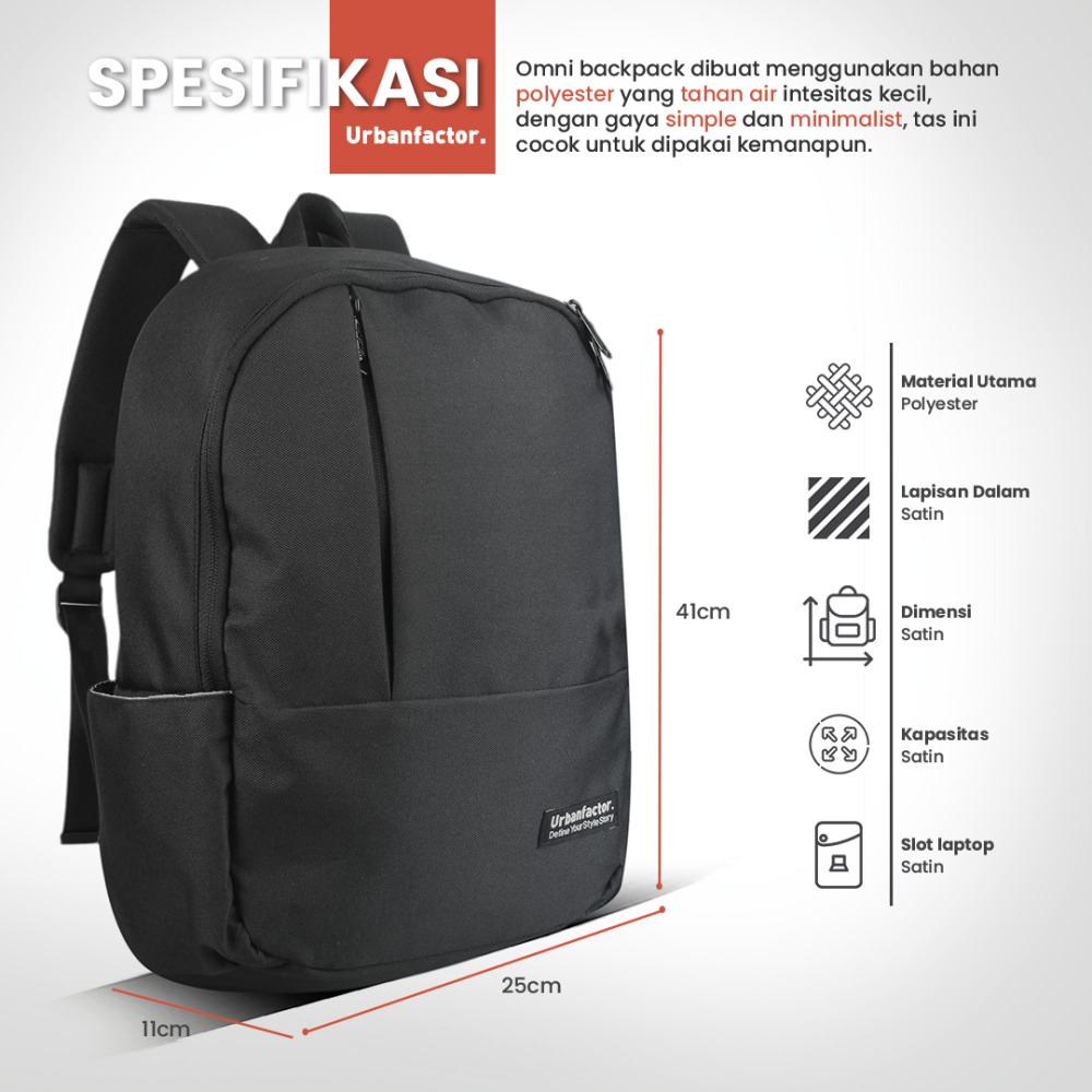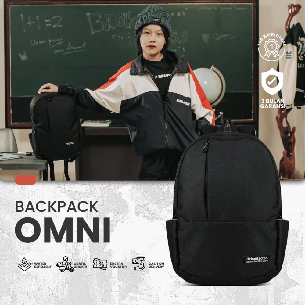 Omni adalah salah satu series Daypack urbanfactorr, Daypack minimalis dengan desain elegan, ringan, dan nyaman untuk aktivitas harian, cocok untuk kerja, kuliah, atau jalan santai.